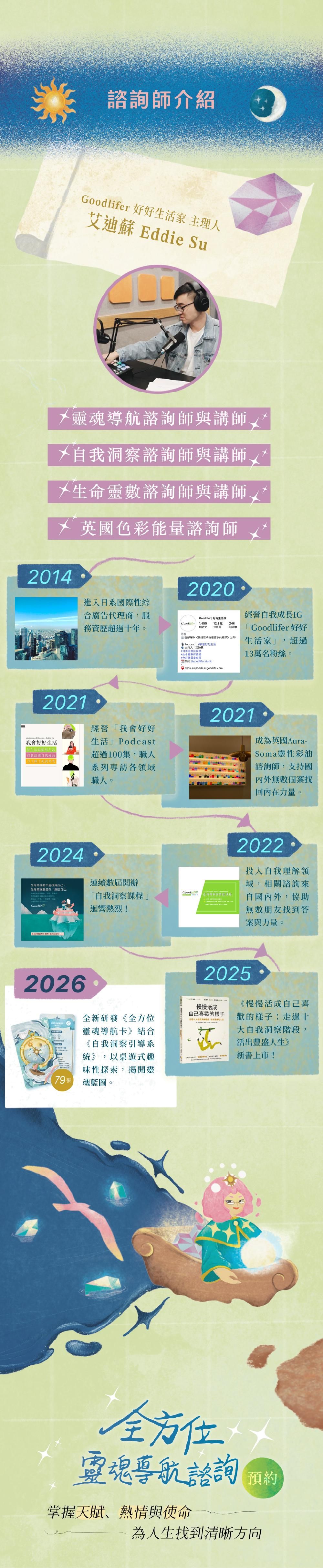 擁有十年日系國際性綜合廣告代理商品牌行銷經驗,致力於推廣從「自我洞察」出發,打造具個人色彩的理想藍圖。主理自我成長型IG(Goodlifer | 好好生活家)社群累積超過十三萬名粉絲,同時主持教育類別Podcast「我會好好生活」頻道,累積近二百集以上內容,邀訪各領域職人訪談,同時在自我理解領域相關諮詢支持國內外無數朋友喚醒內在力量,並連續數屆打造自我理解課程《自我洞察師課程: 自我洞察術X生命靈數》 ,擅長天賦熱情挖掘、課程規劃設計、文創商品設計、個人品牌、社群經營等。2025年6月新書《慢慢活成自己喜歡的樣子》:走過十大自我洞察階段,活出豐盛的人生 上市! 當週即當上博客來預購榜Top3熱門書籍!