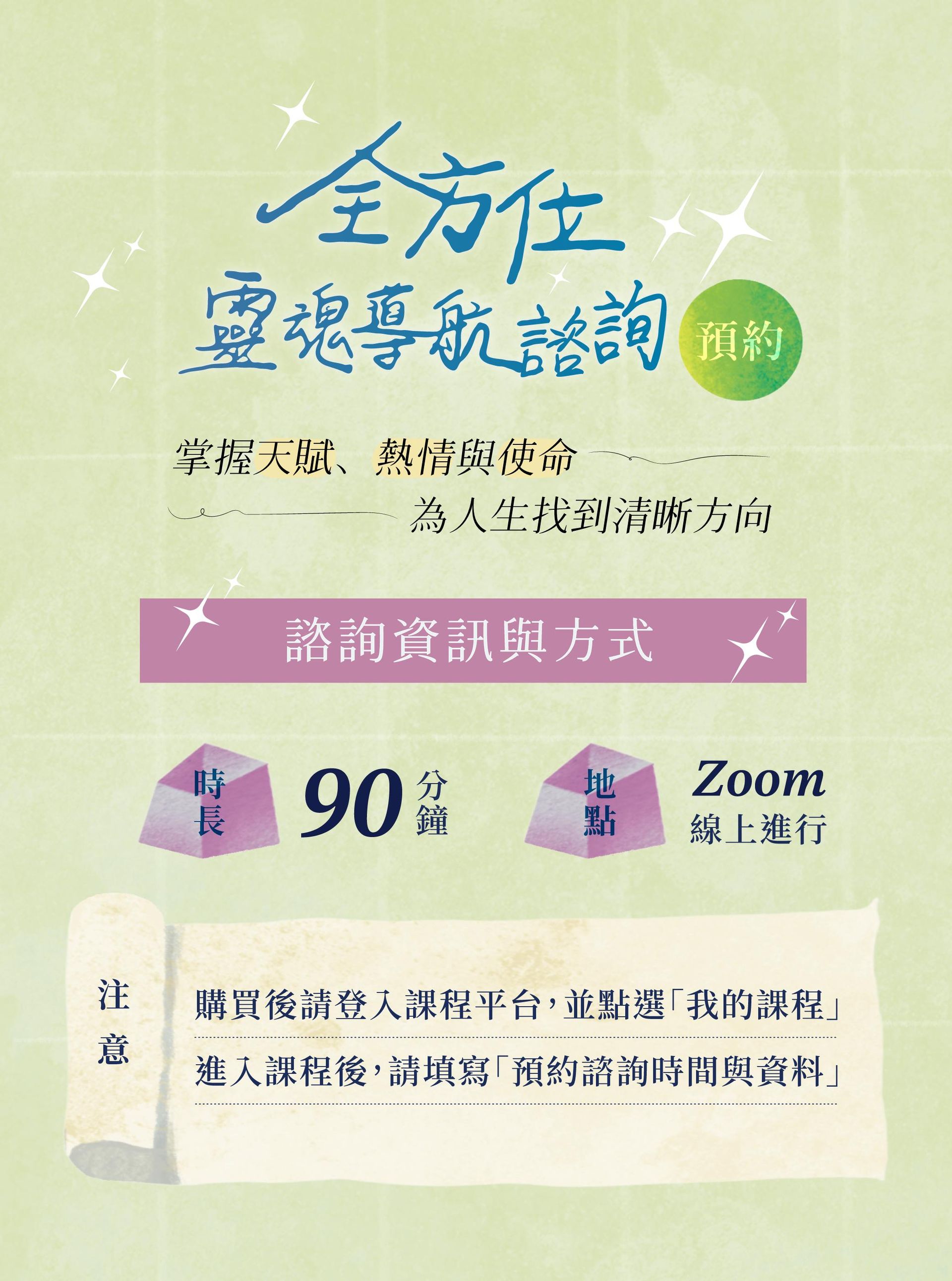 ✨本服務為「線上諮詢」,使用「Zoom」會議平台。時間: 90分鐘內。