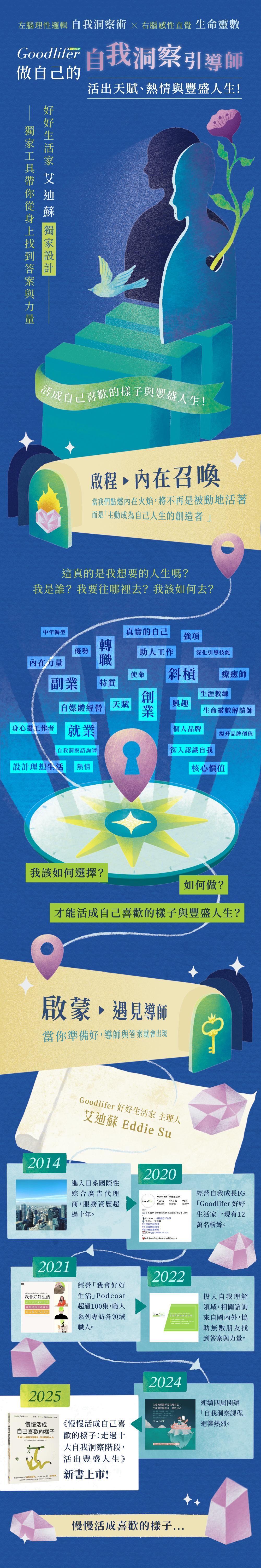 擁有十年日系國際性綜合廣告代理商品牌行銷經驗,致力於推廣從「自我洞察」出發,打造具個人色彩的理想藍圖。主理自我成長型IG(Goodlifer | 好好生活家)社群累積超過十三萬名粉絲,同時主持教育類別Podcast「我會好好生活」頻道,累積近二百集以上內容,邀訪各領域職人訪談,同時在自我理解領域相關諮詢支持國內外無數朋友喚醒內在力量,並連續數屆打造自我理解課程《自我洞察師課程: 自我洞察術X生命靈數》 ,擅長天賦熱情挖掘、課程規劃設計、文創商品設計、個人品牌、社群經營等。2025年6月新書《慢慢活成自己喜歡的樣子》:走過十大自我洞察階段,活出豐盛的人生 上市! 當週即當上博客來預購榜Top3熱門書籍!